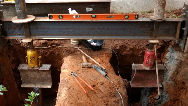 Foi o que foi feito. Com a utilização simultânea de 10 Macacos Hidráulicos, conseguimos levantar todos os pilares e por conseguinte, nivelar o piso da varanda como um todo.