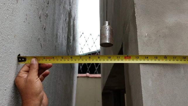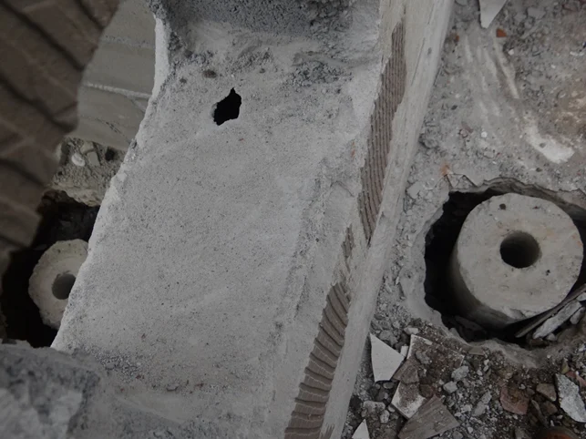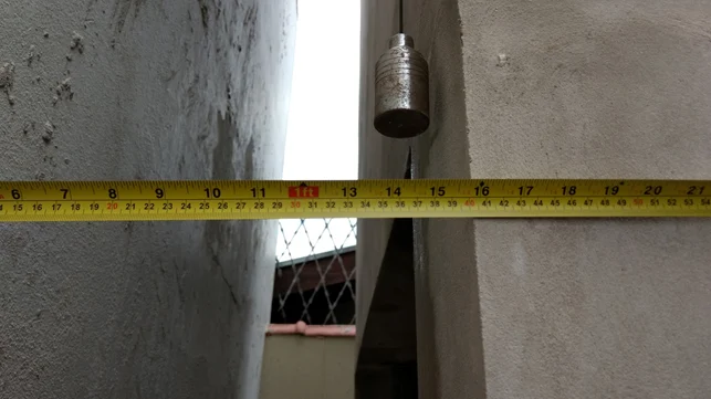 Realizamos uma Visita Técnica para análise da situação como um todo. Verificamos que os 10 pilares estavam em desnível em 11,0 cm e fazendo com quê o piso da varanda se declina-se em direção aos mesmos, devido ao recalque diferencial dos 10 pilares. Estes dez pilares deveriam ser nivelados simultaneamente para que pudesse ser recomposto o nível desta varanda.