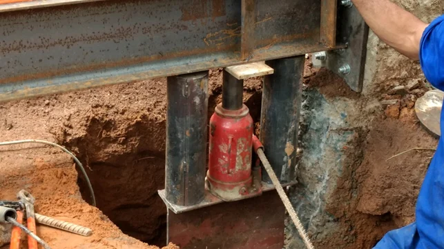 Realizamos uma Visita Técnica para análise da situação como um todo. Verificamos que os pilares estavam em desaprumo em 9,0 cm devido ao recalque diferencial de dois dos pilares. Estes dois pilares deveriam ser nivelados simultaneamente para que pudesse ser recomposto o nível da base dos mesmos.