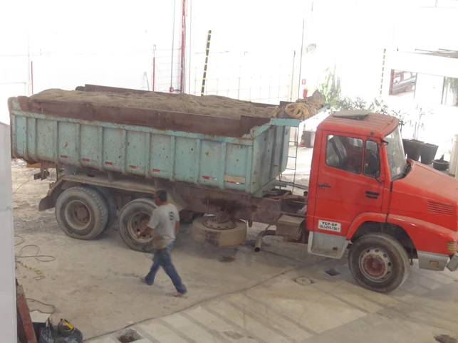 Não havia como executar Fundação através de escavação do solo, nem brocas manuais. O Desafio passou a ser nosso. Não havia, no entorno, elementos estruturais para apoio do Macaco Hidráulico. Tínhamos que projetar um dispositivo para que fosse possível a cravação das estacas. Aí veio a idéia de Locar um caminhão basculante trucado carregado com 12,0 m³ de areia; que nos deu aproximadamente 20,0 tf de carga sem contar com o peso próprio do caminhão. Considerando-se o eixo traseiro, tínhamos aproximadamente15 tf de carga.